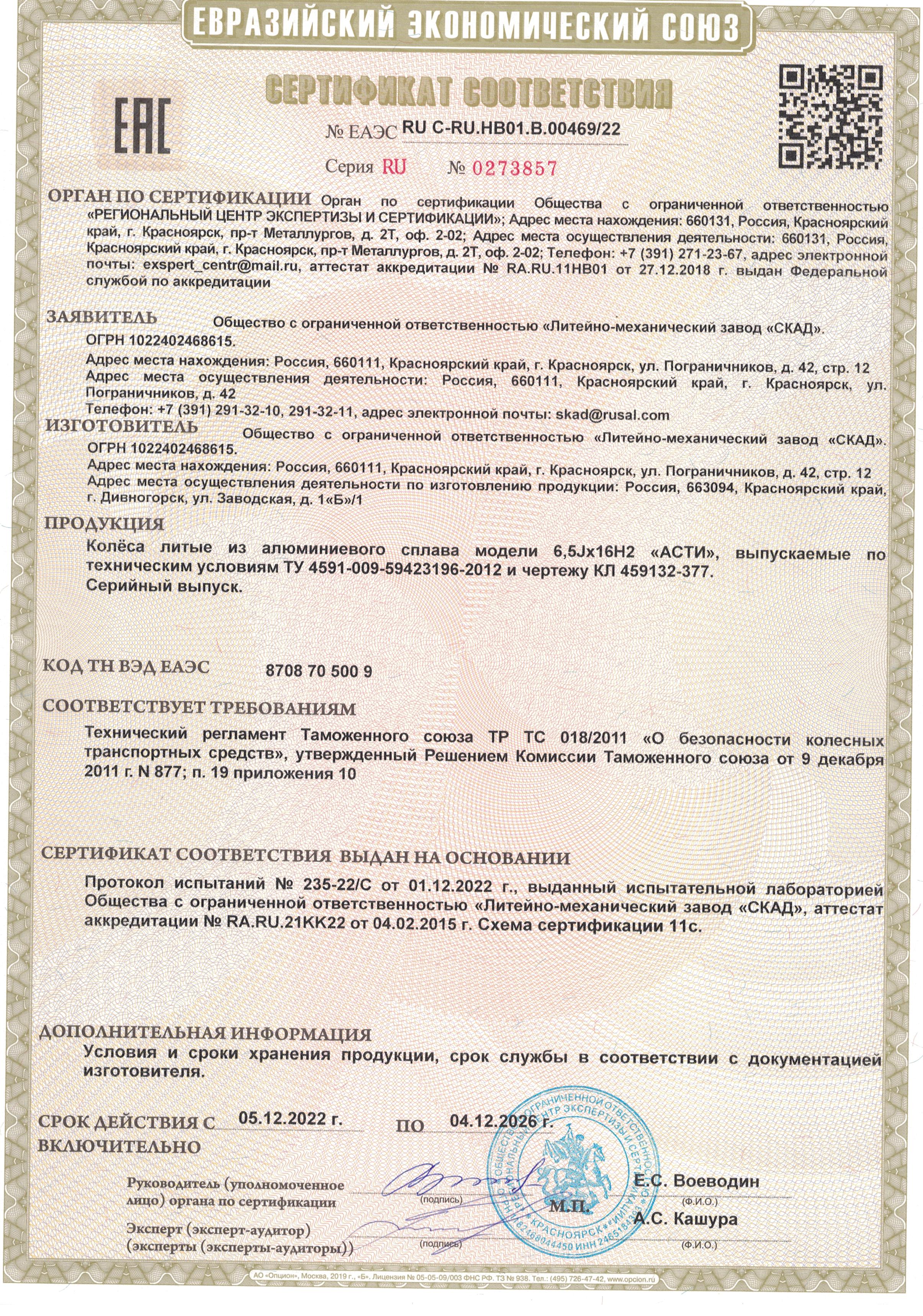 Приобретайте диски SKAD АСТИ 6.500xR16 4x100 DIA60.1 ET41 напрямую от производителя из Сибири. Все представленные в ассортименте диски сертифицированы.